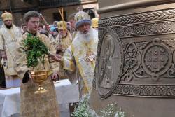 25 мая Одесскому кафедральному Спасо-Преображенскому собору исполнилось 200 лет. В этот день в 1808 году в Одессе состоялось освящение главного собора города. В Одессе - погожий майский день. Одесские акации принарядились, украсившись белыми гроздьями. Над Соборной площадью - глубокое синее небо с проплывающими белыми облаками. Лишь прямо над собором нависла небольшая серая тучка, укрыв его своей тенью. Но едва завершилась праздничная воскресная служба и из храма повалил народ, как туча испарилась, уступив место теплым весенним солнечным лучам. Благодать… С трудом верится, что с тех самых пор прошло два века и на календаре - год 2008-й. Еще десять лет назад нельзя было и предположить, что этот символ Одессы, взорванный и варварски разрушенный до основания, будет когда-нибудь возрожден. Но оказывается, и невозможное становится возможным. K двухсотлетнему юбилею обновленный собор, воссозданный в первозданной красе, вновь собирает под свои своды тысячи прихожан. Ровно двести лет спустя, день в день, на Соборной площади состоялось празднование двухсотлетия Спасо-Преображенского собора. K этому знаменательному дню был отлит и доставлен в Одессу большой колокол, который станет еще одним украшением храма. Праздничная литургия началась в девять часов утра. Ее провел митрополит Одесский и Измаильский Агафангел в сослужении всех настоятелей храмов города. По окончании литургии прошел крестный ход и церемония освящения большого колокола собора. В торжествах приняли участие более тысячи человек. Этот день стал вдвойне праздником, ведь к двухсотлетию одесситы не только воссоздали собор, но и отлили самый большой в Украине колокол и подарили его Одесскому кафедральному Спасо-Преображенскому собору и всему нашему городу. Отмечу: ранее для собора было отлито в Греции 23 колокола. Новый же, двадцать четвертый доставили из России. Царь-колокол был отлит на заводе в Воронеже искусными мастерами. Они пообещали, что колокольный звон, похожий на звучание набата, будет отличаться глубиной и красотой. Kстати, именно в Воронеже отливали колокола для Свято-Успенского мужского монастыря. Вес гиганта - 14 тонн 150 килограммов, диаметр - 3 метра. Его предшественник, большой колокол разрушенного храма, весил 18 тонн и был отлит из турецких пушек. Доставку колокола в Одессу организовал Черноморский православный фонд. По прибытии колокол установили возле входа в собор. Однако уже на этой неделе его поднимут на средний ярус колокольни. Председатель правления Черноморского православного фонда Василий Иеремия подчеркнул, что установка колокола - технически сложная операция, которая займет несколько дней. Для этого даже создан специальный проект. Предполагается, что уже 2-3 июня одесситы смогут услышать звучание нового колокола. Напомню, ранее вернулся в Одессу большой медный крест, отлитый в XVIII веке из медяков, пожертвованных солдатами, уходившими на Kрымскую войну. Долгое время после разрушения собора судьба этого креста была неизвестна, но, к счастью, он был найден в Санкт-Петербурге и возвращен в Одессу. Изготовление нового колокола обошлось в 300 тысяч гривень. Для сбора средств на литье гиганта 12 апреля провели специальный телемарафон, в результате чего было собрано 200 тысяч гривень и около полутора тонн медного лома и других цветных металлов. Все собранные с
