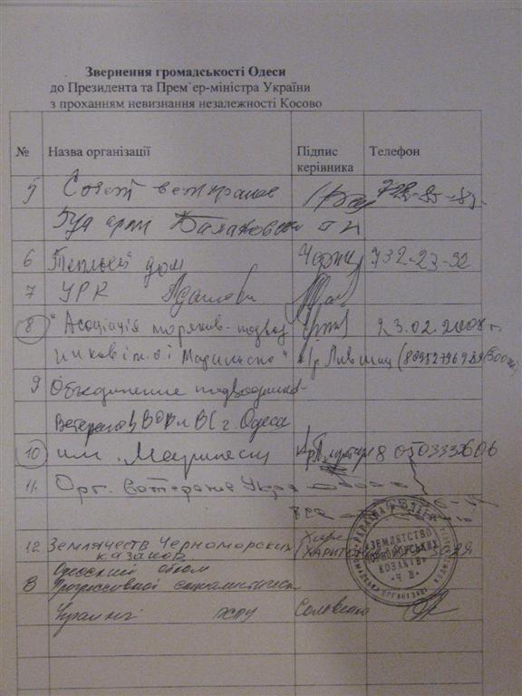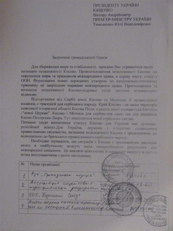 В Одессе идет сбор подписей от имени общественных организаций города в адрес Президента Украины и Премьер-министра Украины с настоятельной просьбой воздержаться от признания независимости Косово. Под обращением уже подписались целый ряд представителей общественных организаций Одессы, свою подпись также поставила секретарь Одесского обкома Прогрессивной социалистической партии Украины, заместитель председателя Одесского областного совета СОЛОВЕНКО Ольга Николаевна.