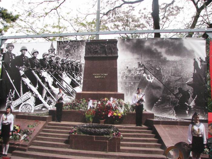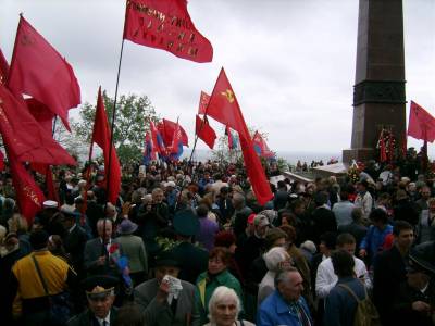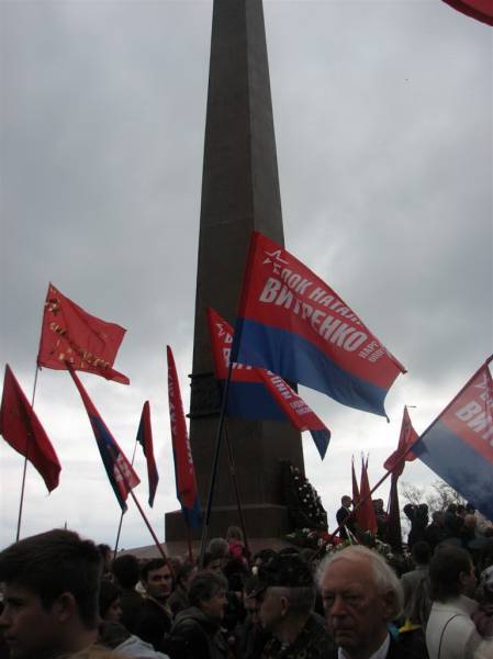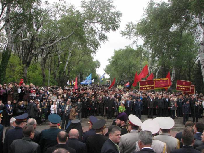 Несмотря на колоссальные усилия украинских властей все 17 лет независимости Украины предать забвению историю нашей великой страны, предать забвению память нашего народа, сегодня, 9 мая, десятки и десятки тысяч людей стряхнули с себя оранжевый дурман, надели на грудь, и стар и млад, георгиевские ленточки, и вместе с ветеранами Великой Войны пошли возлагать цветы к памятнику Неизвестному матросу на Аллее Славы в парке им. Шевченко.