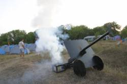На фото - пушка в антинатовском лагере ПСПУ в районе Чабанки в 2007 г. . Сегодня, 2 июля, с полигона около поселка Черноморское, рядом с которым расположился антинатовский лагерь ПСПУ, доносятся автоматные и пулеметные очереди, артиллерийские выстрелы. Прилегающие пляжи заволокло плотными клубами дыма от подожженной степи и гарью от разрывов снарядов. Отдыхающие самостоятельно эвакуируются из опасной зоны НАТОвских учений.
