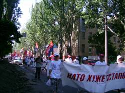 А послушать им было что: "НАТО, гоу хоум!", "НАТО хуже гестапо", "Украинская страна посылает НАТО на..."., скандировали прогрессивные социалисты, представители"Евразийского союза молодежи" и жители Одессы. Витренковцы стали возле пропускного пункта в Дом офицеров, требуя пропустить на мероприятие журналистов из газеты "Предрассветные огни" и депутатов городского и областного советов от Блока Наталии Витренко "Народная оппозиция" . Несмотря на законность требований, милиция , применяя силу, не пропустила в помещение ни журналистов ни депутатов, вход в Дом офицеров оказался заблокированным. Поэтому участникам мероприятия пришлось пробираться на "торжество" окольными путями. Надо отметить, что депутаты от других фракций и "избранные" журналисты были пропущены на мероприятие через другой вход, который "охраняла" вместе с милицией "гвардия" Каурова. Там же, среди кауровцев, стали и малочисленные представители "Просвиты" с плакатом "Одесса за НАТО".