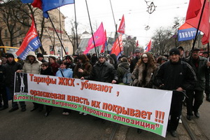 Кризис буржуазной системы захлестнул Украину, а власти как ни в чём не бывало проводят свою грязную политику, не замечая, что народ массово начал гибнуть. Не прошло стороной и Котовск это ужесточённое истребление народа. Неужели наш мэр не видит, что повышение тарифов на коммунальные услуги, не то что оставляет людей с "грошами" на пропитание, а просто-напросто превышает доходы наших горожан? А ему наплевать, просто наплевать на людей, на город - он боится за свою шкуру и умело с улыбочкой считает прибыль... Чего уж скажешь за губернатора, премьера, президента, которые целенаправленно уничтожают народ пытаясь нагло "отбрехаться"... Уже не собираются терпеть котовчане - не тот масштаб обворовывания. Наглости вы набрались преогромной, господа чиновники, вот и наш гнев нарастает соответственно, раз уж зарплаты не растут. По приглашению Блока Наталии Витренко, не смотря на погоду, котовчан 21 февраля в Одессу прибыло немало. Откликнулись многие, хочется так же отметить, что около половины котовчан прибывших на акцию "Так жить нельзя!" составляла молодёжь! Всего одесситов, жителей области и гостей города принявших участие в акции было более 5 тысяч, что не может не радовать, ведь это только начало. Кроме ПСПУ, "Киевской Руси", партии "Возрождение Украинского села" и ряда общественных организаций Блока Наталии Витренко в акции приняли участие АКМ, ВКПБ, ЗУБР, коммунисты, нацболы-одиночки и др. Сбор несогласных проходил к 12:00 на Соборной площади, которые маршем двинули по улицам города к зданию облсовета. В ходе шествия звучали хиты Ивана Баранова, советские песни и воодухотворяющий марш ПСПУ. В руках у участников акции были плакаты с надписями: «Так жить нельзя!», «Выживем вместе с Россией», «МВФ к ответу за цензуру и разруху», «Долой оранжевую хунту", «Тарифы ЖКХ - убивают, оранжевая власть их покрывает», «Если Рада тужится - голова от проблем кружится» и др. На Соборную так же пришли пропиариться пятёрка проплаченных СЛС господина Волги пытаясь всучить в руки несогласным свою макулатуру, но заметив волнения котовчан СЛСовцы поспешили убраться восвояси. В районе Привоза к акции подключилась некая Нина Кочановская держа в руках несколько флагов Партии Регионов, заявив, что «пока Янукович отдыхает» она работает за всю Партию Регионов. Флаги ПР удалось рассредоточить среди несогласных, но это было жалкое зрелище, особенно, когда "регионалы" были тоже причислены к виновникам сложившейся в Украине ситуации... Перед участниками акции протеста выступили председатель ПСПУ Наталия Витренко, лидер профсоюзной организации Конфедерация Труда Украины Владимир Марченко, руководитель областной организации ПСПУ в Одесской области, заместитель председателя Одесского областного совета Ольга Соловенко, председатель обкома ПСПУ николаевской области Лариса Шеслер, лидер областной организации партии «Киевская Русь», депутат от Блока Витренко в Одесском горсовете Валентин Чернов и др. На митинге у здания облсовета народ единогласно поддержал резолюцию, зачитанную Наталией Витренко. Настроение у котовчан боевое, возвращались мы с песнями. Проложив начало авангард решительно настроен на новые акции. Уверенны, что наша численность увеличится! Правящая буржуазия будет привлечена к ответу!