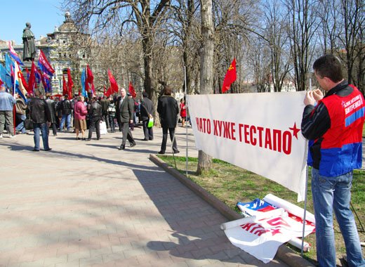 Около 500 человек с символикой Блока Натальи Витренко, КПУ, ПР, партий «Родина» и «Киевская Русь» собрались на площади, чтобы публично выдвинуть обвинения НАТО, ставя в вину этой военной организации вмешательство во внутренние дела Украины, содействие «оранжевой революции», препятствие выполнению международных обязательств Украины, преступления против славянской цивилизации, разжигание третьей мировой войны и развязывание локальных военных конфликтов.