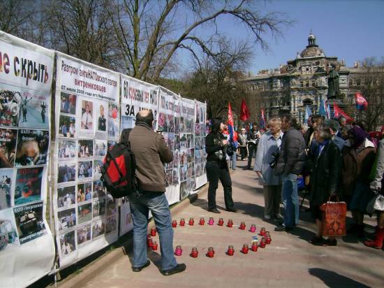В ходе митинга на площади была развернута фотовыставка «Одесса обвиняет НАТО», на которой представлено несколько десятков снимков, сделанных во время военных конфликтов. Экспозиция вызвала довольно бурную реакцию горожан – люди ставили у стендов поминальные свечи и требовали, чтобы подобные зверства не повторились на территории Украины.