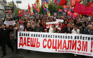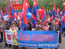 На призыв Блока Наталии Витренко "Народная оппозиция" провести Первомайскую акцию протеста в столице Украины откликнулись тысячи наших граждан со всех уголков страны: от Луганска до Львова, от Севастополя до Чернигова. Жаль, конечно, что не все имели возможность приехать в Киев, однако не менее трёх тысяч человек, истинных патриотов Отечества, ратующих за возрождение подлинно свободной и процветающей Украины, съехались утром 1 Мая к заводу "Арсенал" для участия в демонстрации и митинге под главным Первомайским девизом: "Долой капиталистическое рабство! Даёшь социализм!". И это естественно, ведь 1 Мая – праздник революционный, день международной солидарности трудового народа в борьбе за свои права.