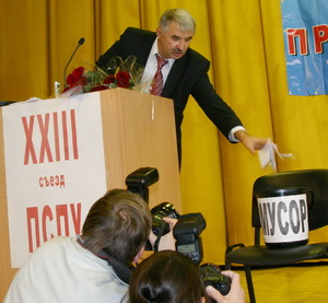 На ХХІІІ (внеочередном) съезде Прогрессивной социалистической партии Украины народный депутат Украины І, ІІ и ІІІ созывов, заместитель Председателя ПСПУ Владимир Марченко выбросил в мусорное ведро программы всех кандидатов в Президенты, зарегистрированных в Центризбиркоме.