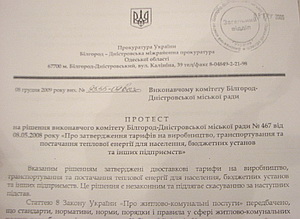 Только что Белгород-Днестровская межрайонная прокуратура Одесской области внесла ПРОТЕСТ Белгород-Днестровскому исполкому на решение исполнительного комитета Белгород-Днестровского городского совета N467 от 08.05.2008 года "Об утверждении тарифов на производство, транспортировку и поставку тепловой энергии для населения, бюджет