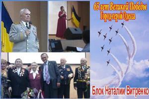 В рамках празднования 65-летия Победы над фашизмом в Одессе продолжаются мероприятия по чествованию ветеранов Великой Отечественной войны. 11 мая 2010 года в Одесской юридической Академии, по Благословлению Митрополита Одесского и Измаильского - Агафангела, состоялась встреча одесситов с ветеранами Великой Отечественной войны, воинской службы и труда. Участие в праздничном мероприятии приняли представители Блока Наталии Витренко Валерий Сергачев и Владимир Сорокин. Приветствуя ветеранов и организаторов замечательней акции, председатель областной организации Партии "Киевская Русь", депутат облсовета Блока Наталии Витренко, комбат, воин-афганец Валерий Сергачев сказал, что: "выполняя интернациональный долг в Афганистане, мы брали пример со своих отцов и дедов, воевавших в Испании, разгромивших фашизм, защищавших Вьетнам, Анголу, Сирию..., с честью выполнивших патриотический долг перед Родиной! Ветераны Великой Отечественной войны были для нас примером подражания, и мы Вас не подвели. Мы не предаем Вас и сегодня. В настоящее время вся политическая деятельность Блока Наталии Витренко направлена на сохранение и защиту наших цивилизационных ценностей – Православие, русский язык, историческая правда Победы Советского народа над фашизмом, братский союз народов Белоруссии, России и Украины". Прекрасно организовала встречу ветеранов Ангелина Гайдарова. Приветствовали ветеранов лицеисты Одесского военного лицея, детский хор школы имени Столярского. Своими воспоминаниями поделились фронтовики – десантник генерал-лейтенант в отставке Горелов, партизан Новомир Царихин, который сегодня является хранителем памяти в музее Южного Оперативного Командования. Активисты – витренковцы в ходе встречи, вручили ветеранам книги одесского автора Андрея Шишкина "Письмо заложника". Главным подарком ветеранам стал концерт композитора и режиссёра Ольги Дубовиной, приехавшей специально для данного мероприятия из Москвы. Она исполнила современные патриотические песни и песни военных лет, наполнив сердца участников благодарной памятью обо всех наших героических предках, которые на протяжении нескольких столетий защищали наше Отечество от супостатов - завоевателей.