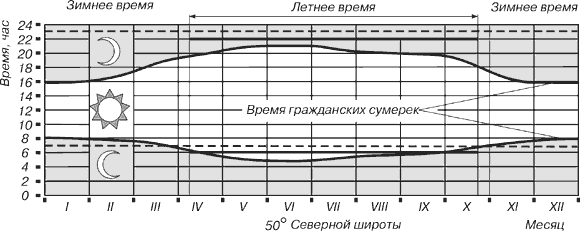 Как показано на схеме, изменение светлого и темного времени суток в течение года для широты 50° (широта Киева). Границей между светлым и темным временем принято считать начало или конец так называемых гражданских сумерек, то есть времени, когда Солнце опустилось за горизонт на 6°. По вечерам к этому моменту на улицах города следует включать освещение. На графике указано солнечное истинное время (истинное солнечное время начинается и заканчивается в полдень, т.е. когда светило проходит через меридиан и стоит максимально высоко).