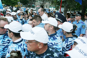 Фото 35. Депутаты Блока Наталии Витренко « Народная оппозиция» , члены ПСПУ , добровольцы защищают антинатовский митинг, г.Одесса июль 2007г.